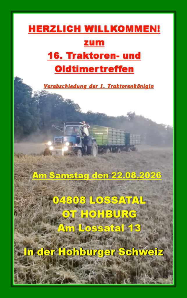 Am 3. September 2024 war die neulich frisch gewählte 1. Sächsische Traktoren Königin, Lilly KEYMER, zu Besuch beim Alterspräsident Horst BÄRSCH, ehemaliger Vorsitzender des Lanzclub Sachsen. Horst war sichtlich erfreut über das Erscheinen von Lilly und führte sie durch seine private Lanz Bulldog Sammlung. Als Geschenk überreicht Lilly Horst eine Erinnerungsplakette vom vor kurzem statt gefundenen Hohburger Traktorentreffen.