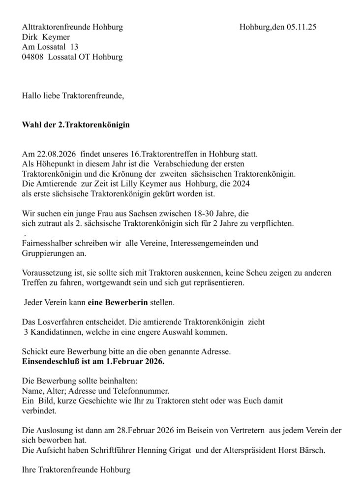 Am 3. September 2024 war die neulich frisch gewählte 1. Sächsische Traktoren Königin, Lilly KEYMER, zu Besuch beim Alterspräsident Horst BÄRSCH, ehemaliger Vorsitzender des Lanzclub Sachsen. Horst war sichtlich erfreut über das Erscheinen von Lilly und führte sie durch seine private Lanz Bulldog Sammlung. Als Geschenk überreicht Lilly Horst eine Erinnerungsplakette vom vor kurzem statt gefundenen Hohburger Traktorentreffen.